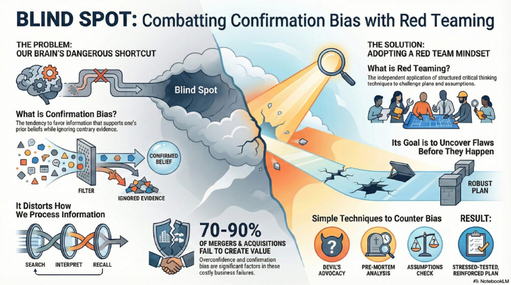 | Information Processing | Confirmation Bias | Favoring information that confirms existing beliefs.11 | Polarization, poor strategy, medical error. | “Consider the Opposite,” Devil’s Advocate, Blind Analysis. |